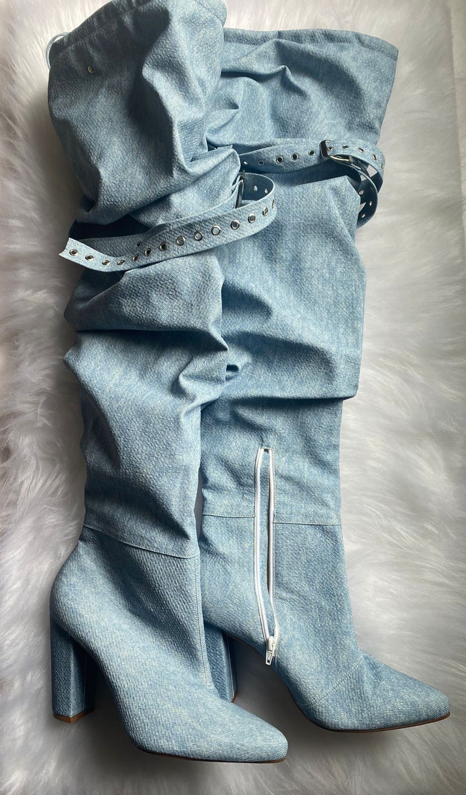 O salto bloco garante conforto e estabilidade, enquanto o detalhe da correia jeans com fecho no cano alto adiciona estilo extra e exclusividade ao design. Versátil e marcante, essa bota é ideal para composições criativas e produções cheias de atitude.